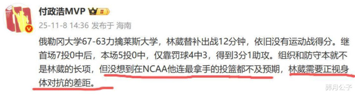 对于这两场比赛林葳的表现,媒体人付政浩也发文总结——组织和防守本来就不是林葳的强项,但没想到在NCAA,他连最基本的投篮都不达预期,林葳需要正视身体对抗的差距。